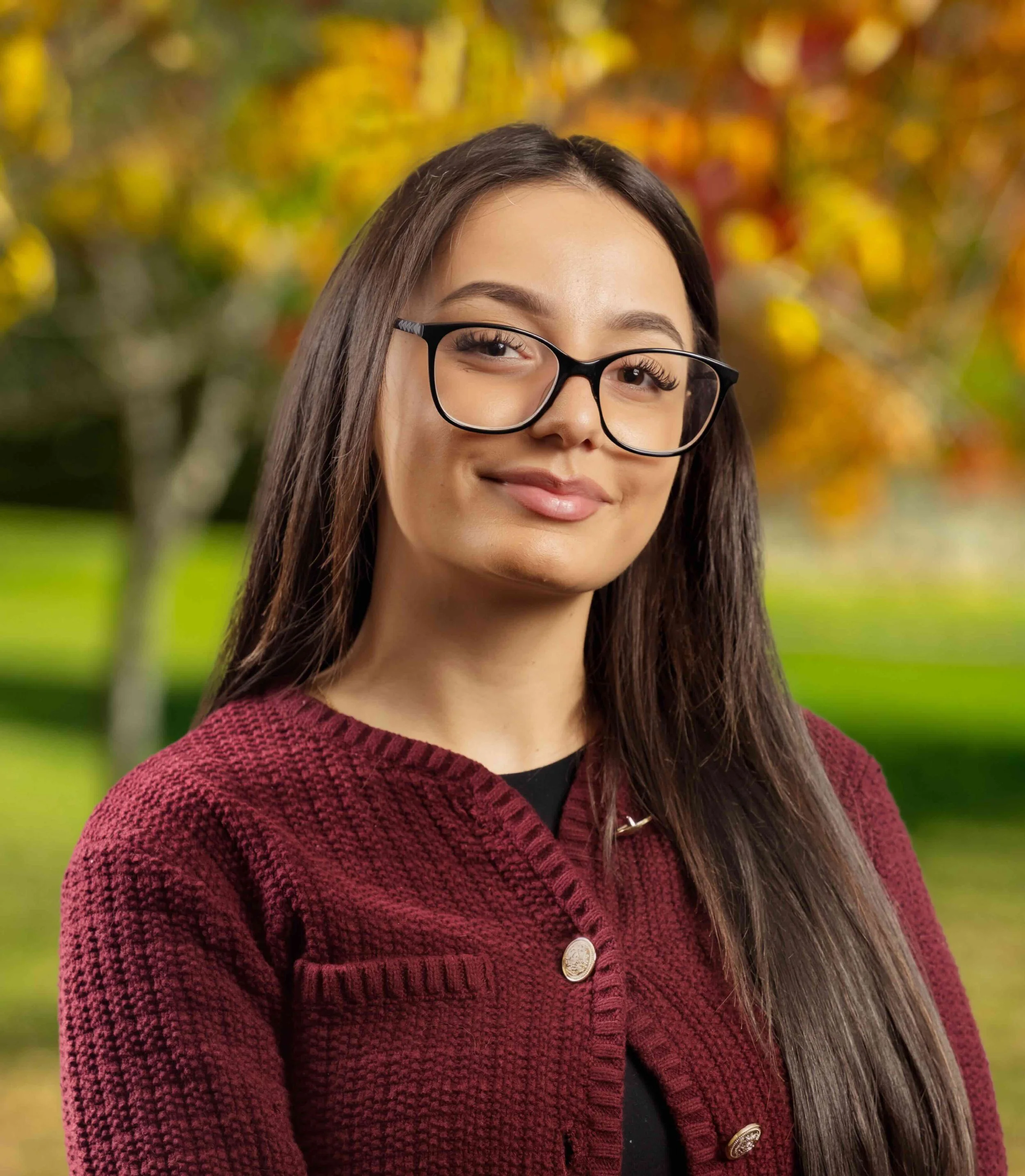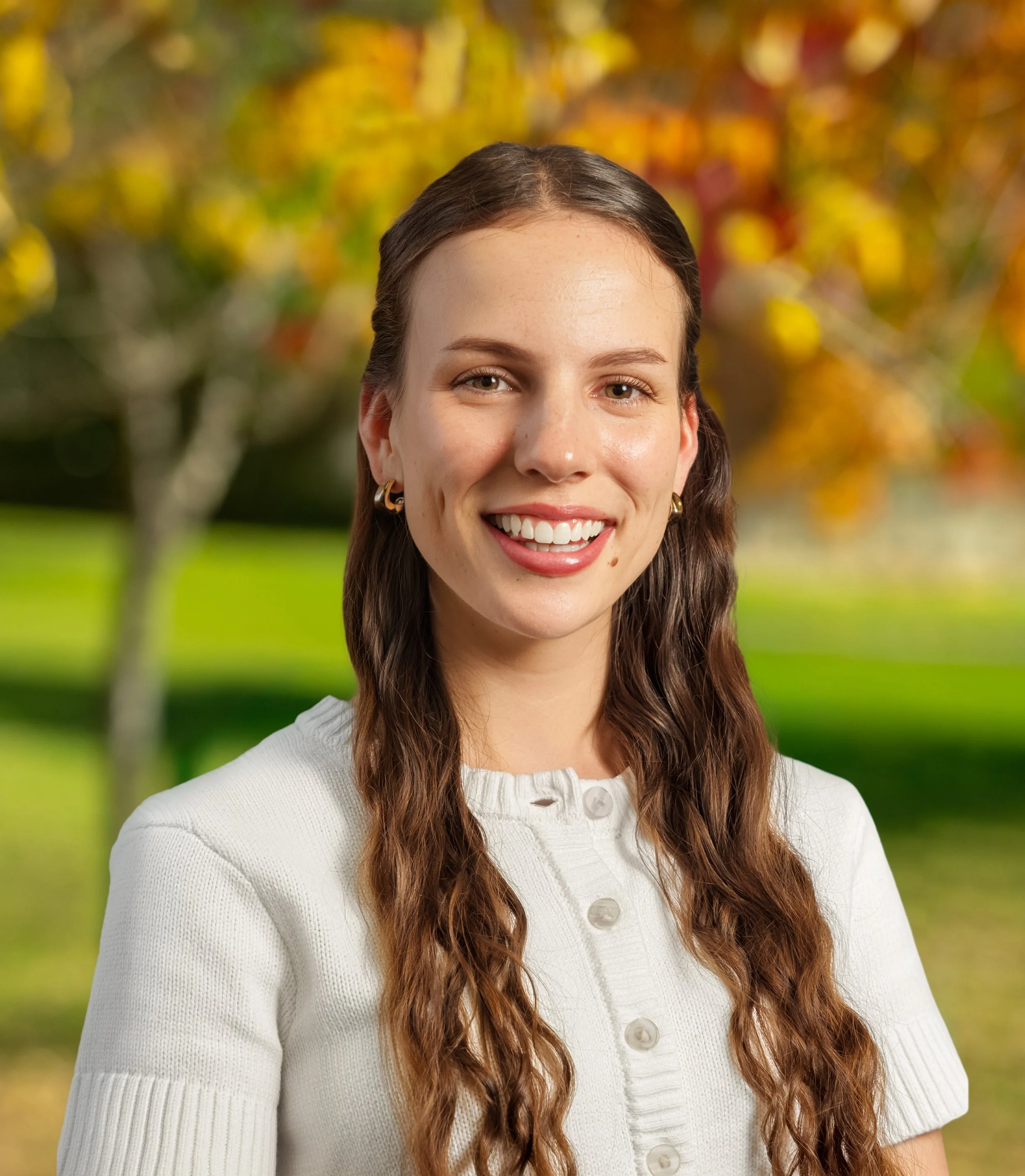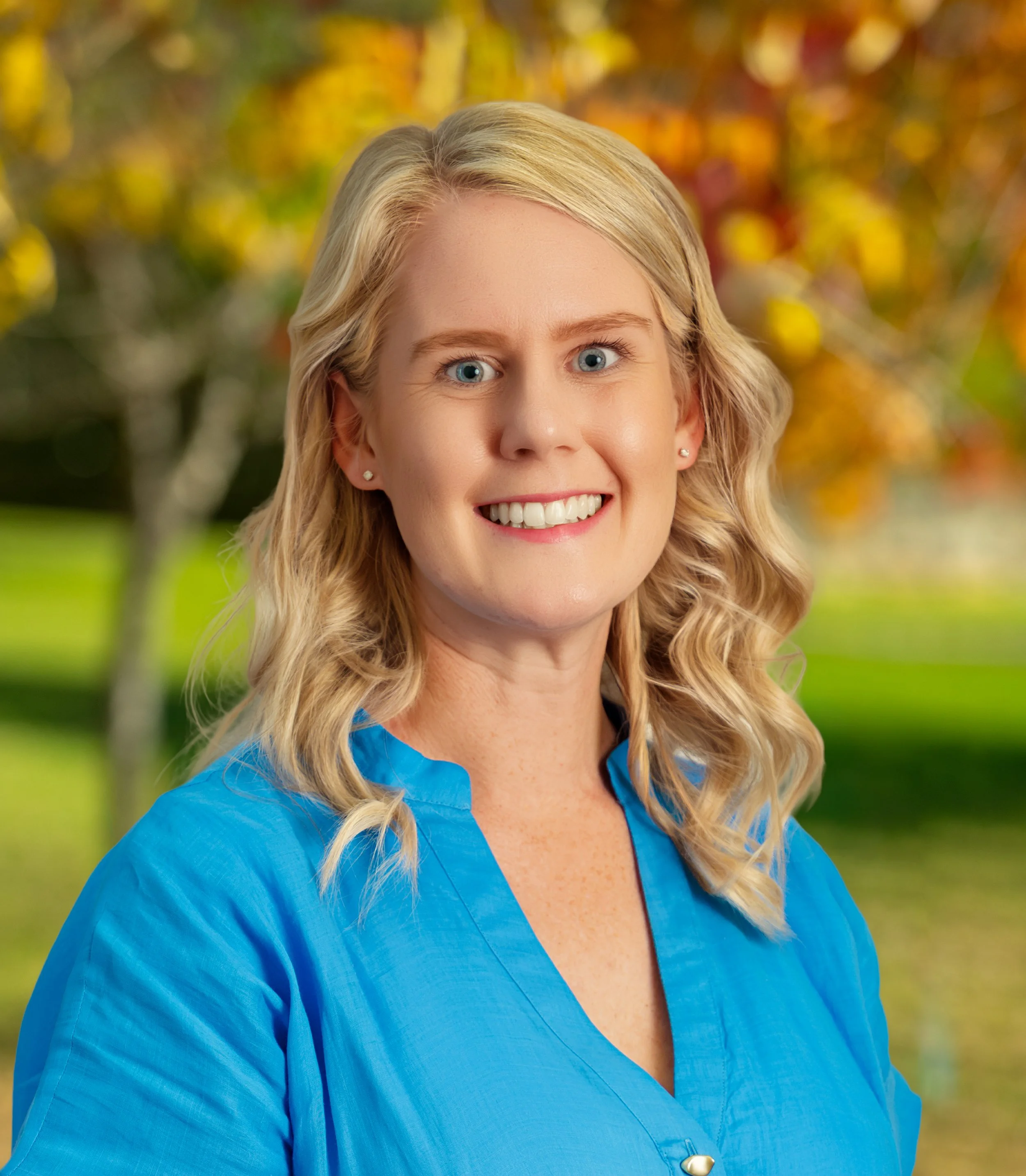 A young woman with light brown hair wearing a blue button-up shirt and necklace, smiling outdoors with fall foliage in the background.