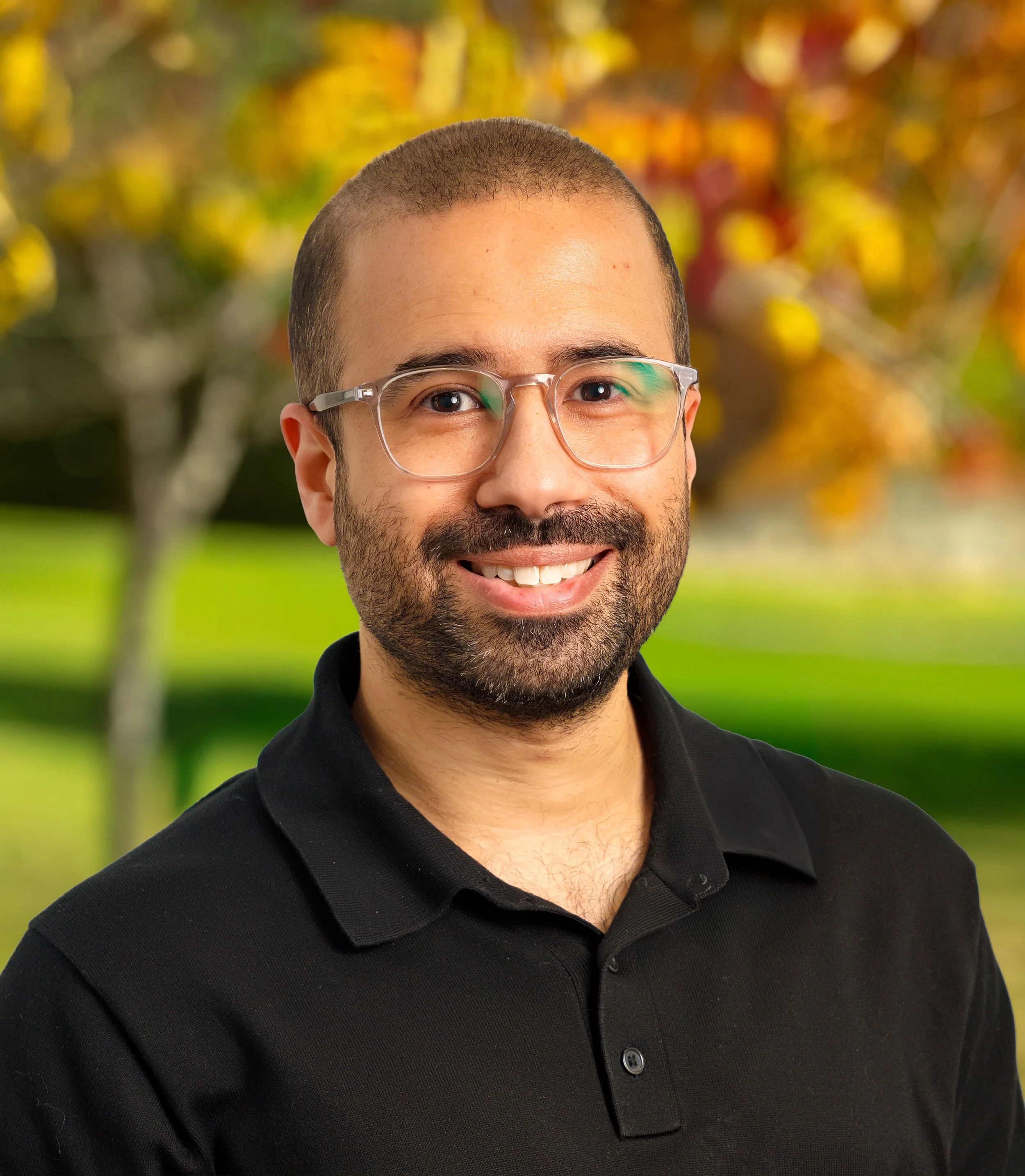 A woman with short dark hair and glasses standing outdoors with trees and fall foliage in the background.